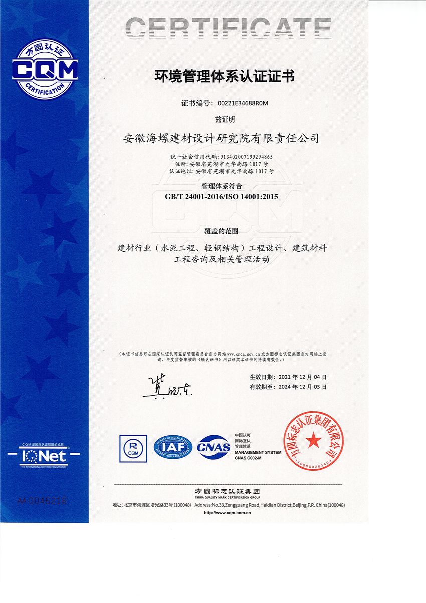 12月8日,海螺設(shè)計(jì)院正式收到方圓標(biāo)志認(rèn)證集團(tuán)有限公司頒發(fā)的質(zhì)量、環(huán)境、職業(yè)健康安全管理體系認(rèn)證證書,標(biāo)志著海螺設(shè)計(jì)院在管理創(chuàng)新過程中又取得一項(xiàng)新的成果。